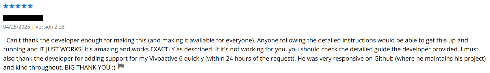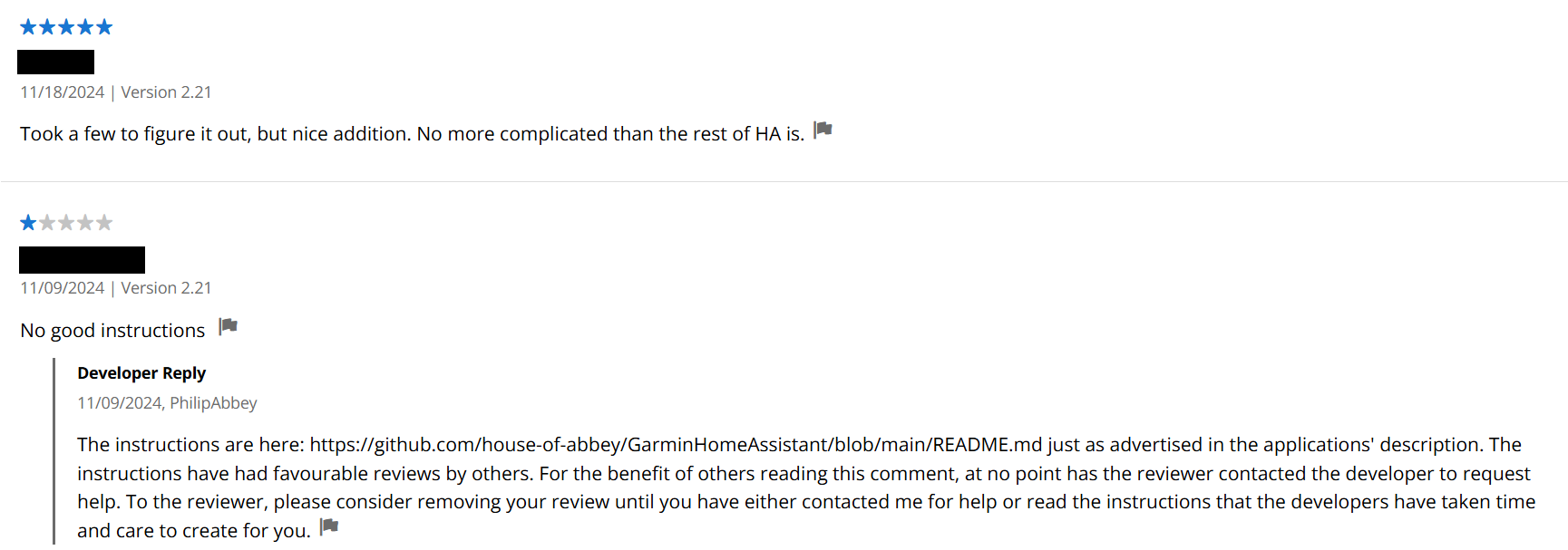 The Connect IQ user [redacted] has sent you the following request regarding your app “GarminHomeAssistant (Application)”: