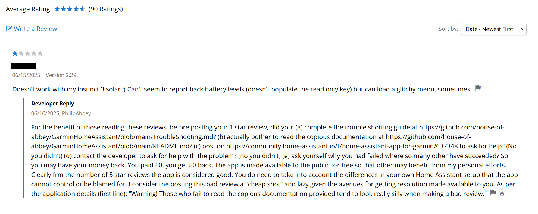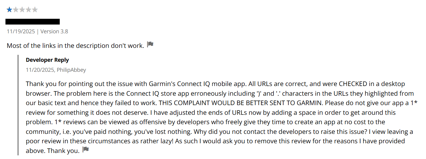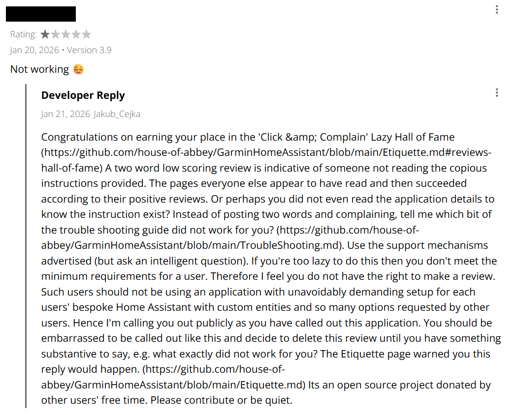 Start a discussion on Home Assistant App for Garmin forum page. Be careful not to make a false claim about the product, e.g. one that is caused by your own mistake, you are posting publicly and might get an unwelcome reply. Instead, post a query for confirmation or a suggestion. Leave yourself room to back down from any careless claims!